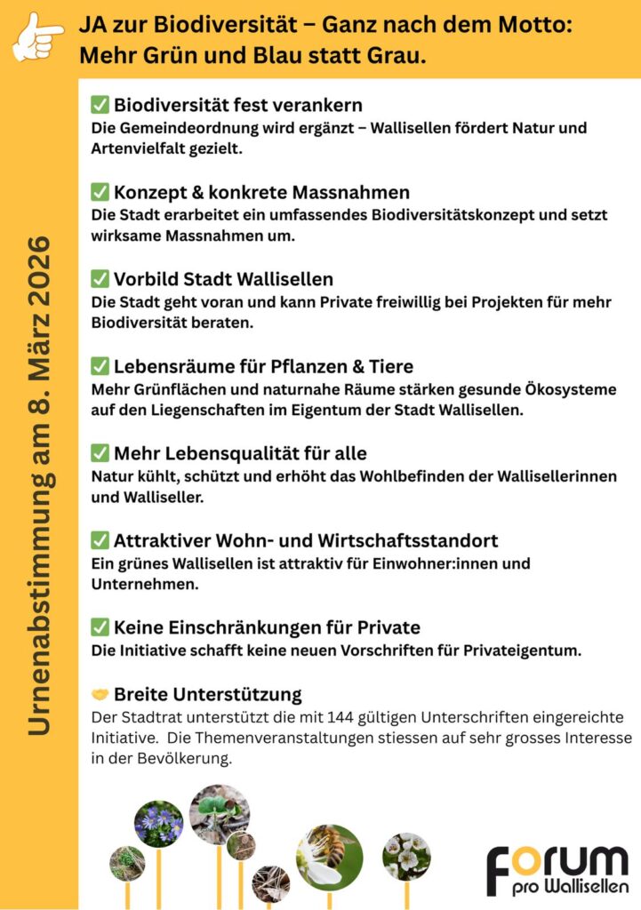 Mit einem JA am 8. März 2026 zur Initiative sagt Wallisellen JA zur Natur, mehr Lebensqualität, mehr Zukunft – ganz nach dem Motto mehr Grün und Blau statt Grau.