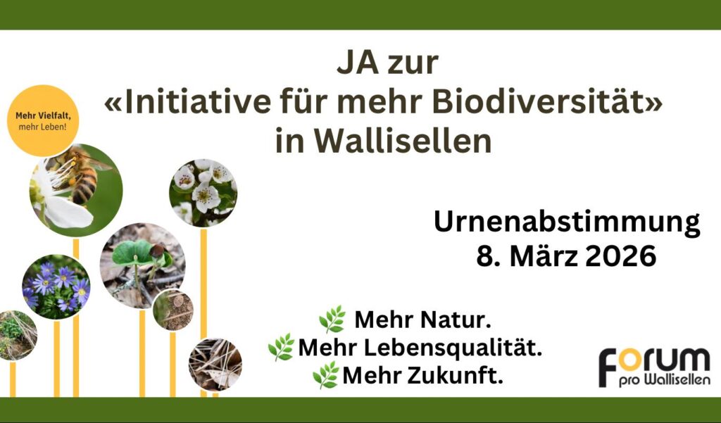 Der Stadtrat unterstützt «Initiative für mehr Biodiversität» vom Forum pro Wallisellen. Sie beantragt eine Ergänzung der Gemeindeordnung mit dem Ziel, die Biodiversität auf dem gesamten Stadtgebiet zu fördern. Dafür sei ein Konzept zu erarbeiten. Die Stadt solle eine Vorbildfunktion einnehmen und Beratungen anbieten. Der Stadtrat schreibt im Sinne des Forums: «Die Biodiversität schafft gesunde und widerstandsfähige Ökosysteme von grossem Wert für das menschliche Wohlergehen und die wirtschaftliche Wertschöpfung. Der Schutz unserer Lebensgrundlagen ist ein Verfassungsauftrag. Ein Massnahmenplan soll die verbindliche Umsetzung des Konzepts sichern.»