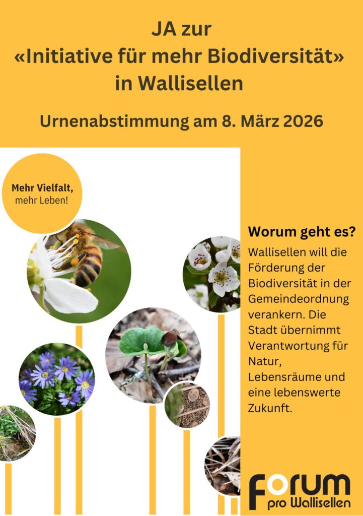 Darum wird das Forum pro Wallisellen wird die «Initiative für mehr Biodiversität in Wallisellen» bis zu den Sommerferien einreichen, welche die Schaffung eines übergeordneten Biodiversitätskonzepts fordert sowie die Einführung eines neuen Artikels zur Förderung der Biodiversität in der Gemeindeordnung vorsieht. Damit könnten weitere Projekte angeregt werden und insbesondere auch neue Dienstleistungen für die Bevölkerung entstehen: beispielsweise eine Naturgartenberatung, Sträucher-Eintauschaktionen oder eine Neophyten-Hotline.