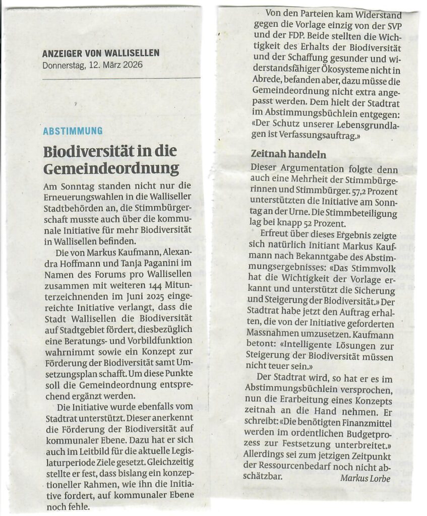 Ende Juni reichten die Erstunterzeichnenden die Initiative für mehr Biodiversität in Wallisellen ein mit 144 gültigen Unterschriften. Mehr dazu in unserem Artikel im Anzeiger von Wallisellen vom 3. Juli 2025.