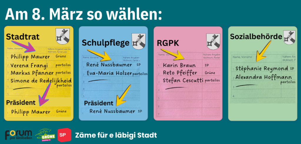 Forum pro Wallisellen, Grüne und SP setzen sich weiterhin für ein lebendiges und lebenswertes Wallisellen ein und bedanken sich bei den Wählerinnen und Wählern für die Unterstützung im ersten Wahlgang.